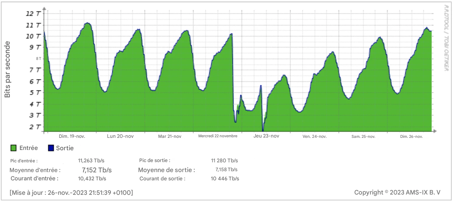 En novembre 2023, AMS-IX subit deux pannes majeures cumulant plus de 5 heures d’interruption. Le trafic chute de 10 To/s à 2 To/s, impactant de nombreux fournisseurs européens dépendant de cet échangeur.