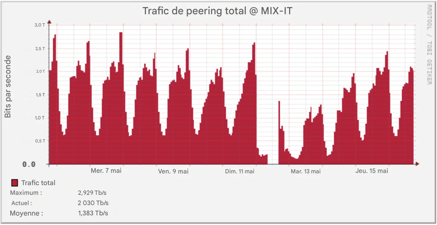 Le 12 mai 2025, une panne chez le Milan Internet Exchange (MiX) perturbe nombre de services locaux, provoquant ralentissements et indisponibilités à échelle nationale.